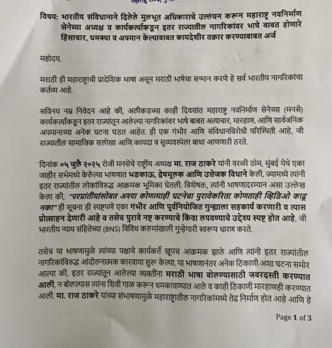 यह पत्र अधिवक्ता पंकज मिश्रा, नित्यानंद शर्मा और आशीष राय द्वारा संयुक्त रूप से प्रेषित किया गया है, जिसमें उन्होंने राज ठाकरे पर आरोप लगाया है कि उन्होंने महाराष्ट्र में मराठी भाषा के सम्मान की आड़ में उत्तर भारतीय भाषी नागरिकों को सार्वजनिक रूप से अपमानित किया। उनका बयान, “मराठी बोलो नहीं तो महाराष्ट्र छोड़ो”, न केवल भारत के संविधान के अनुच्छेद 14, 15 और 19 का उल्लंघन करता है, बल्कि सामाजिक सौहार्द को भी गंभीर रूप से प्रभावित करता है।