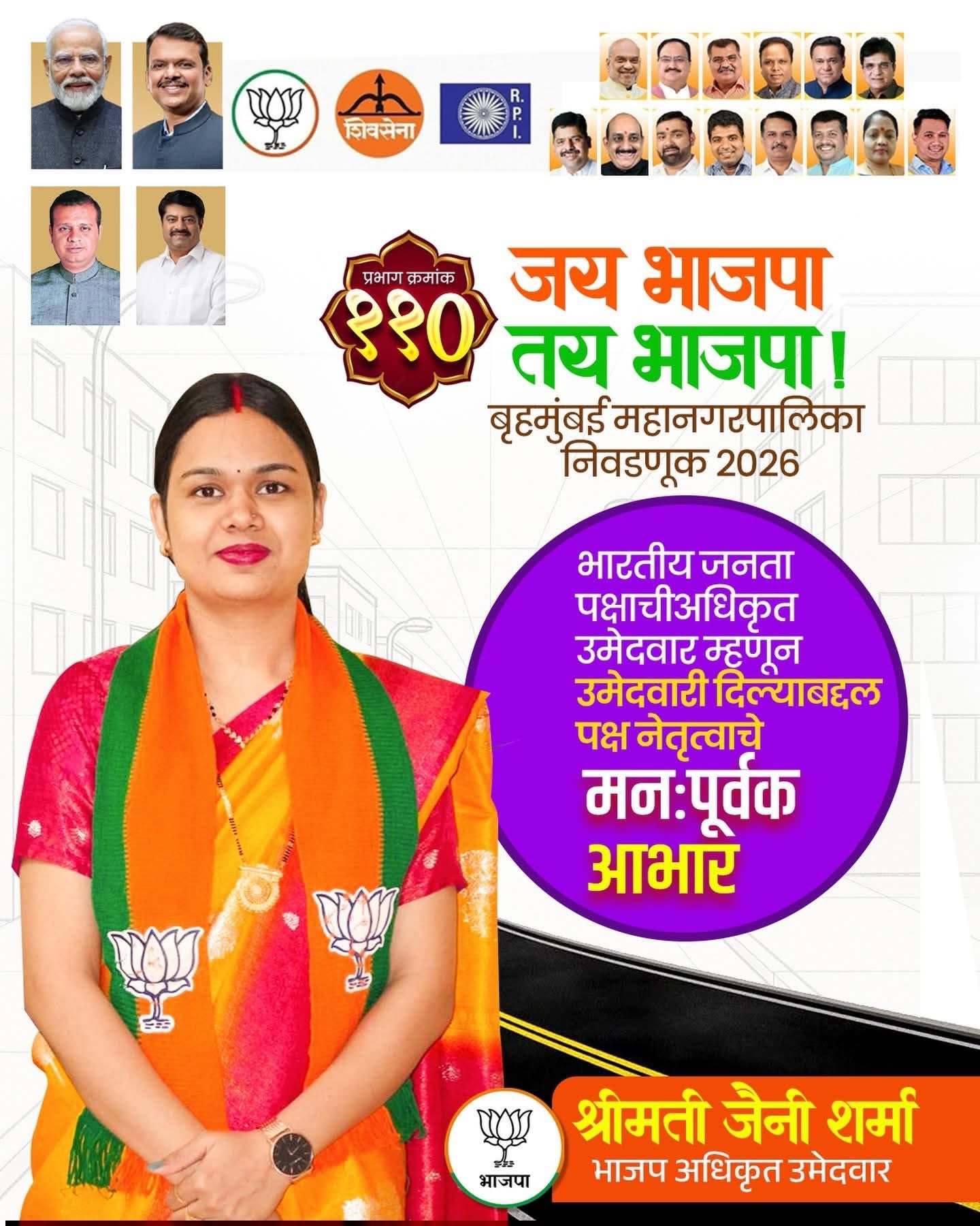 आगामी बृहन्मुंबई महानगरपालिका चुनावों के लिए भांडुप वार्ड क्रमांक 110 से भारतीय जनता पार्टी की अधिकृत उम्मीदवार श्रीमती जैनी शर्मा जी ने आज अपना नामांकन पत्र सफलतापूर्वक दाखिल किया। नामांकन के साथ ही भांडुप क्षेत्र में चुनावी सरगर्मियां तेज हो गई हैं।