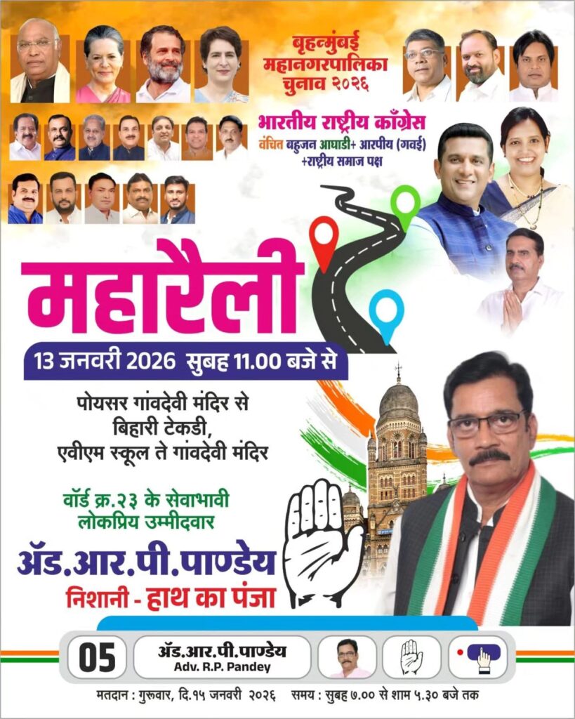 बृहन्मुंबई महानगरपालिका चुनाव के मद्देनज़र प्रभाग क्रमांक 23 में चुनावी सरगर्मियां तेज हो गई हैं। प्रभाग के सर्वांगीण विकास का संकल्प लेकर मैदान में उतरे शिक्षित एवं जनप्रिय उम्मीदवार एडवोकेट आर. पी. पांडे को जनता का व्यापक समर्थन मिल रहा है। जनसंपर्क अभियानों और प्रचार सभाओं में उमड़ रही भीड़ यह संकेत दे रही है कि क्षेत्र में बदलाव की लहर बन चुकी है।