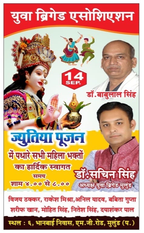 युवा ब्रिगेड असोसिएशन द्वारा पिछले 50 वर्षो से उत्तर भारतीय महिलाओं हेतु ज्यूतिया (जीवित पुत्रिका व्रत) पूजन समारोह काआयोजन स्व.रामकृपाल सिंह प्रांगण, भान बाई निवास, गोकुल हॉस्पिटल के सामने,म.गाँधी रोड़,मुलुंड प. पर किया जा रहा है l