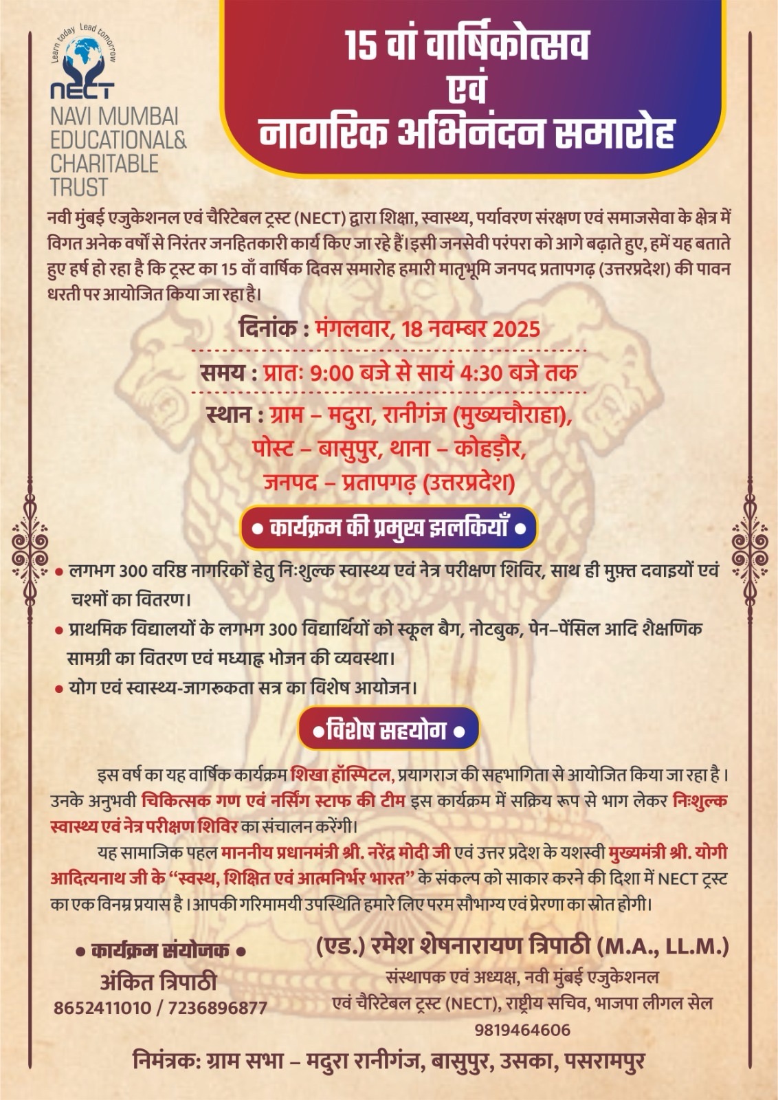नवी मुंबई एजुकेशनल एंड चैरिटेबल ट्रस्ट (NECT) द्वारा शिक्षा, स्वास्थ्य, पर्यावरण संरक्षण एवं समाजसेवा के क्षेत्र में विगत कई वर्षों से निरंतर जनहितकारी कार्य किए जा रहे हैं। इन्हीं सेवाभावी परंपराओं को आगे बढ़ाते हुए ट्रस्ट का 15वां वार्षिकोत्सव एवं नागरिक अभिनंदन समारोह आगामी मंगलवार, 18 नवम्बर 2025 को जनपद प्रतापगढ़ (उत्तर प्रदेश) के ग्राम मडुरा, रानीगंज (मुख्यचौराहा), पोस्ट–बासुपुर, थाना–कोहडौर में आयोजित किया जा रहा है।